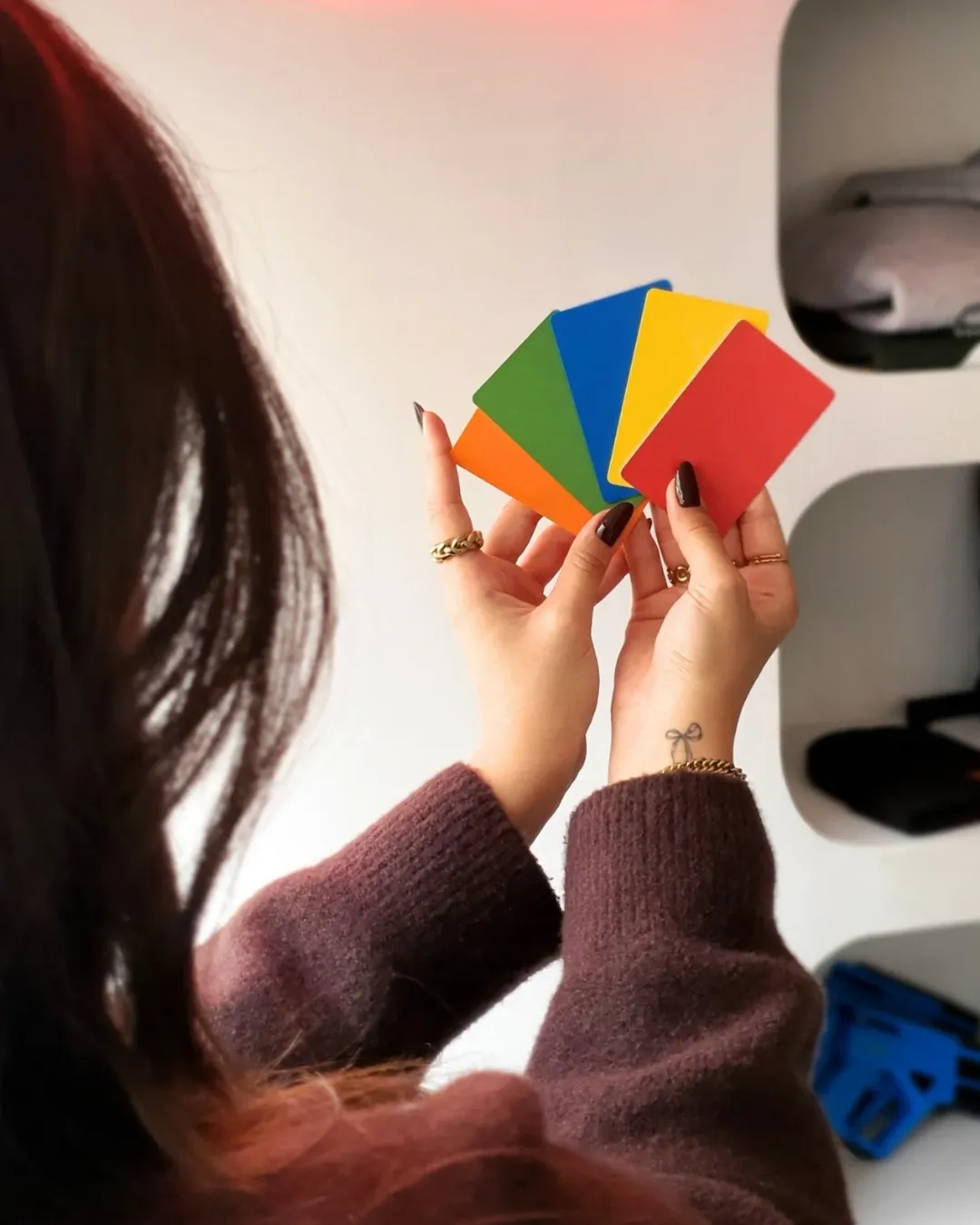 Escolhe o material, PVC, bambu/madeira ou fibra, define a quantidade e personaliza o cartão com o teu design ou com modelos pré definidos.